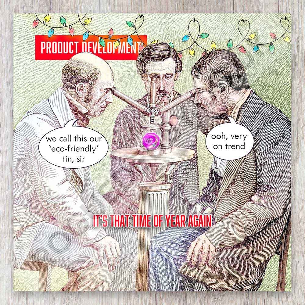 3 scientists sit round a joint microscope to inspect the new eco-friendly size Christmas tin of favourites.